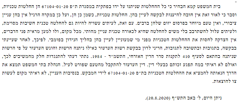 בית המשפט קמא הבהיר כי כל ההחלטות שניתנו על ידו בפתקית במסגרת ת"פ 67104-01-20 הן החלטות טכניות, וסבר כי לאור זאת אין חובה להיענות לבקשה לעיין בהן. החלטות טכניות, כשמן כן הן, ועל כן במקרה הרגיל אין בהן עניין ציבורי, ואין טעם מיוחד בפרסום יזום שלהן ברבים. עם זאת, לעיתים עשויה להיות גם להחלטה טכנית חשיבות מסוימת, ולעיתים עלול להשתרבב בלי משים להחלטה שהיא לכאורה טכנית עניין מהותי. מכל מקום, ולו למען מראית פני הדברים, אין הצדקה לחסות את ההחלטות הטכניות מפני מי שמעוניין לעיין בהן בהליך הנידון בפומבי. לפיכך, לאחר שעיינתי בבקשה, בתגובות ובתשובה לתגובות, הריני לדון בבקשת רשות הערעור כאילו ניתנה הרשות והוגש הערעור על פי הרשות שניתנה בהתאם לסעיף 410 לתקנות סדר הדין האזרחי, התשמ"ד – 1984. נתתי דעתי להתנגדות חלק מהמשיבים לכך, ואולם לא ראיתי במה תפגע זכותם כבעלי דין. דין הערעור להתקבל מהטעם שפורט לעיל. הנהלת בתי המשפט תמצא את הדרך הנאותה להמציא את ההחלטות הטכניות בת"פ 67104-01-20 לידי המבקש. בנסיבות העניין, לא ראיתי מקום לעשות צו להוצאות.
